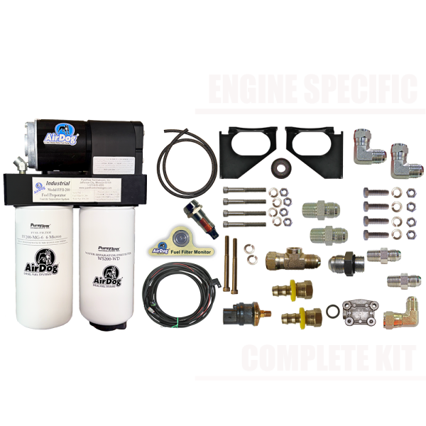 This kit includes (1) AirDog® FPII-200 4G Demand Flow System, (1) FF200-MG-6 Fuel Filter, (1) WS200-WD Water Separator, (1) 5E-2-010 Wiring Harness with Indicator Light, (2) Mounting Brackets with Hardware, 7 Feet of DOT Air/Vapor Return Line, and (1) Cummins N14 (with Pump Mount Filter) Engine-Specific Fitting Kit (all fittings needed in most cases).