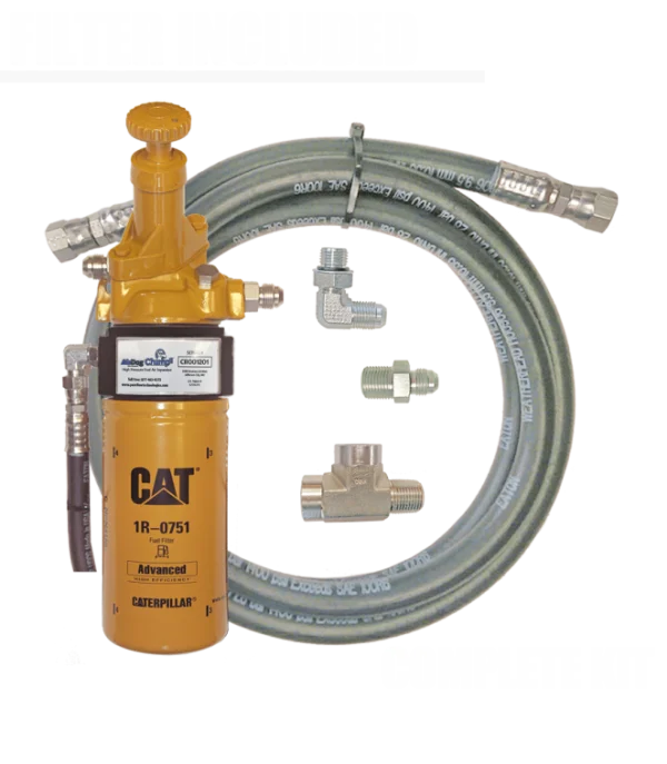 This AirDog® Champ™ II is a spin-on high-pressure fuel air separator, specific to CAT engines with secondary filters. This system provides the same benefits as the Champ™, by removing entrained air and vapor before entering the fuel injection system, as well as offering a simple spin-on installation, mounting easily to the OEM secondary fuel filter head. This system includes: (1) AirDog® Champ™ II, (1) CAT 1R-0751 Fuel Filter, (1) Return Line Hose Assembly, and (1) CAT Engine-Specific Fitting Kit (all fittings needed in most cases).